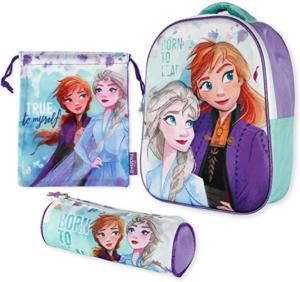 Mochila, estuche y bolsa de la merienda con diseño Frozen 2. El kit ideal para niñ@s a partir de 3 años. Distintas medidas para diferentes usos a lo largo del día. Mochila escolar con tirantes: 26 x 31 x 10 cm. Bolsa de merienda: 26,5 x 21,5 cm. Estuche escolar: 21,5 x 7,5 x 7,5 cm. Material de poliéster resistente y ligero. Todos los productos son fáciles de usar para los niños.